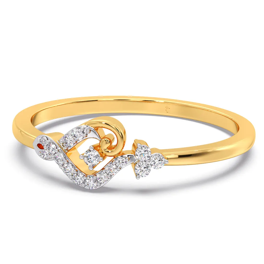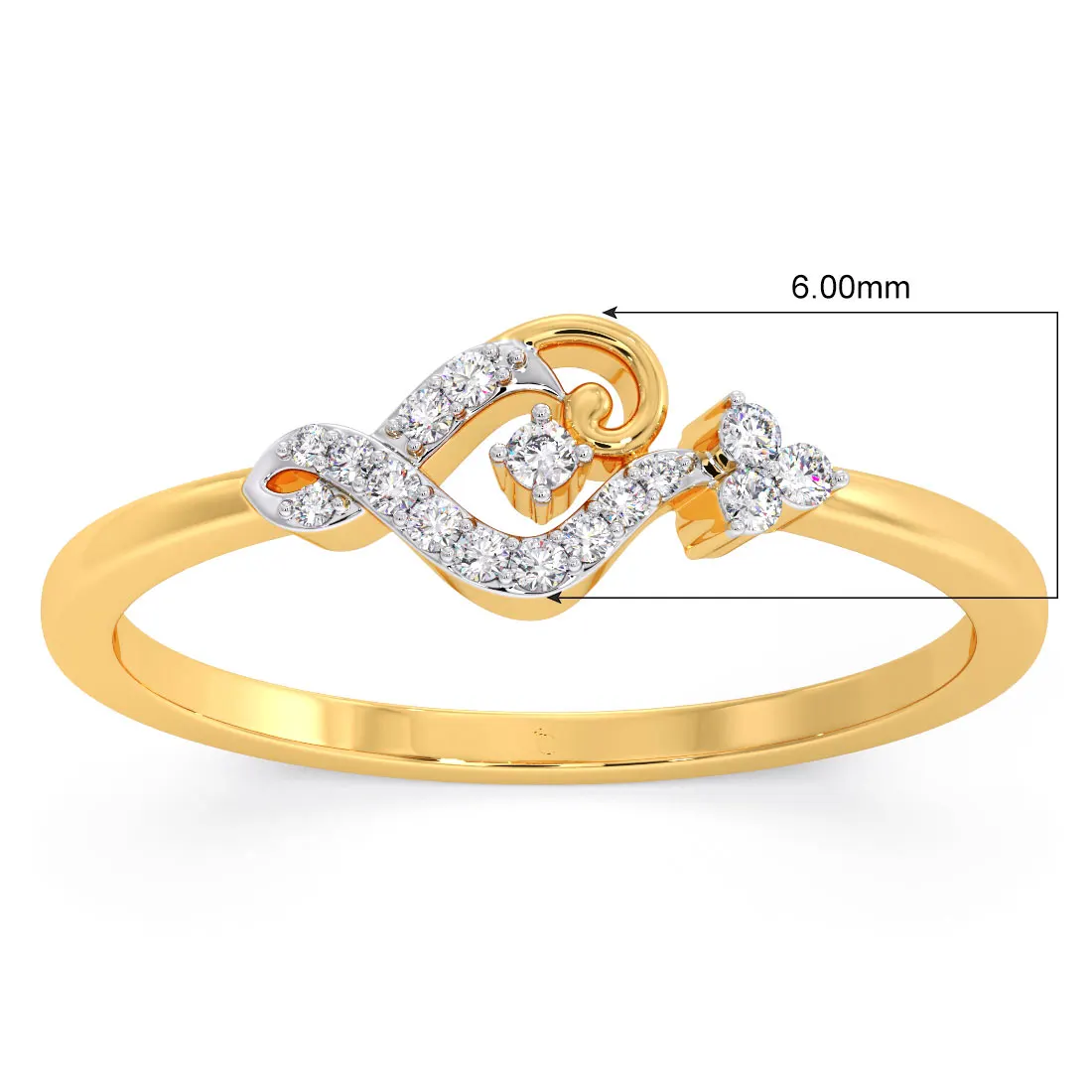 The delicate curves of the ring create a stylish flow, highlighting the central diamond and surrounding stones for a luxurious and eye-catching look. The combination of gold and shimmering diamonds gives this ring a timeless appeal, making it perfect for both everyday elegance and special occasions.